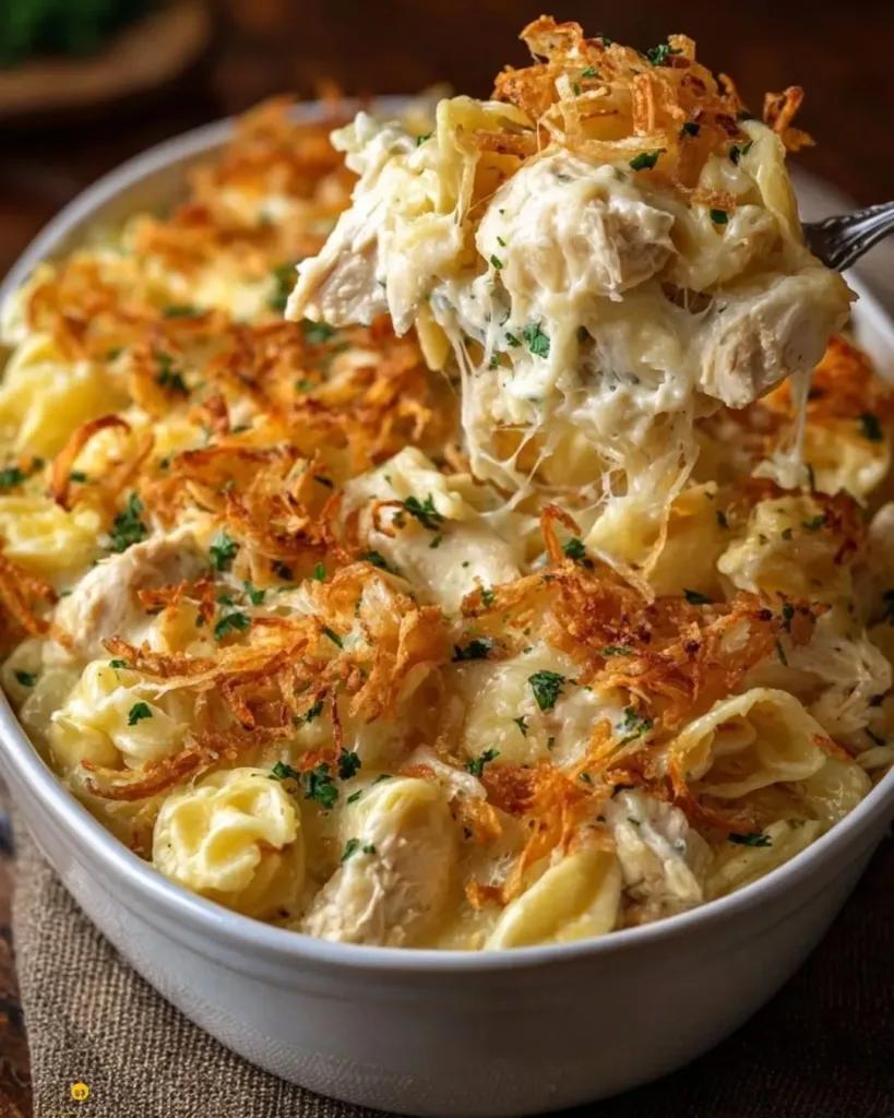 A creamy, cheesy, and comforting casserole that combines tender chicken, cheesy tortellini, and the rich flavors of French onion dip, topped with crispy fried onions for a delightful crunch.